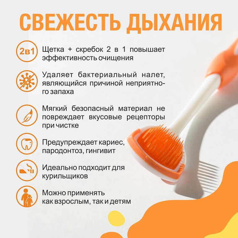 Является лучшим дополнением к каждодневной гигиене. Удаляет бактериальный налет, являющийся причиной несвежего дыхания и заболеваний полости рта. Мягкий безопасный материал не повреждает вкусовые рецепторы при чистке.